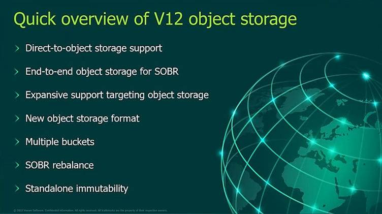A new object storage format is also in place for V12, this will improve performance by addressing some of the large calls made to the object storage platform. There are also now multiple buckets per SOBR, workloads bigger than 50TB can be split across server buckets to help with performance.